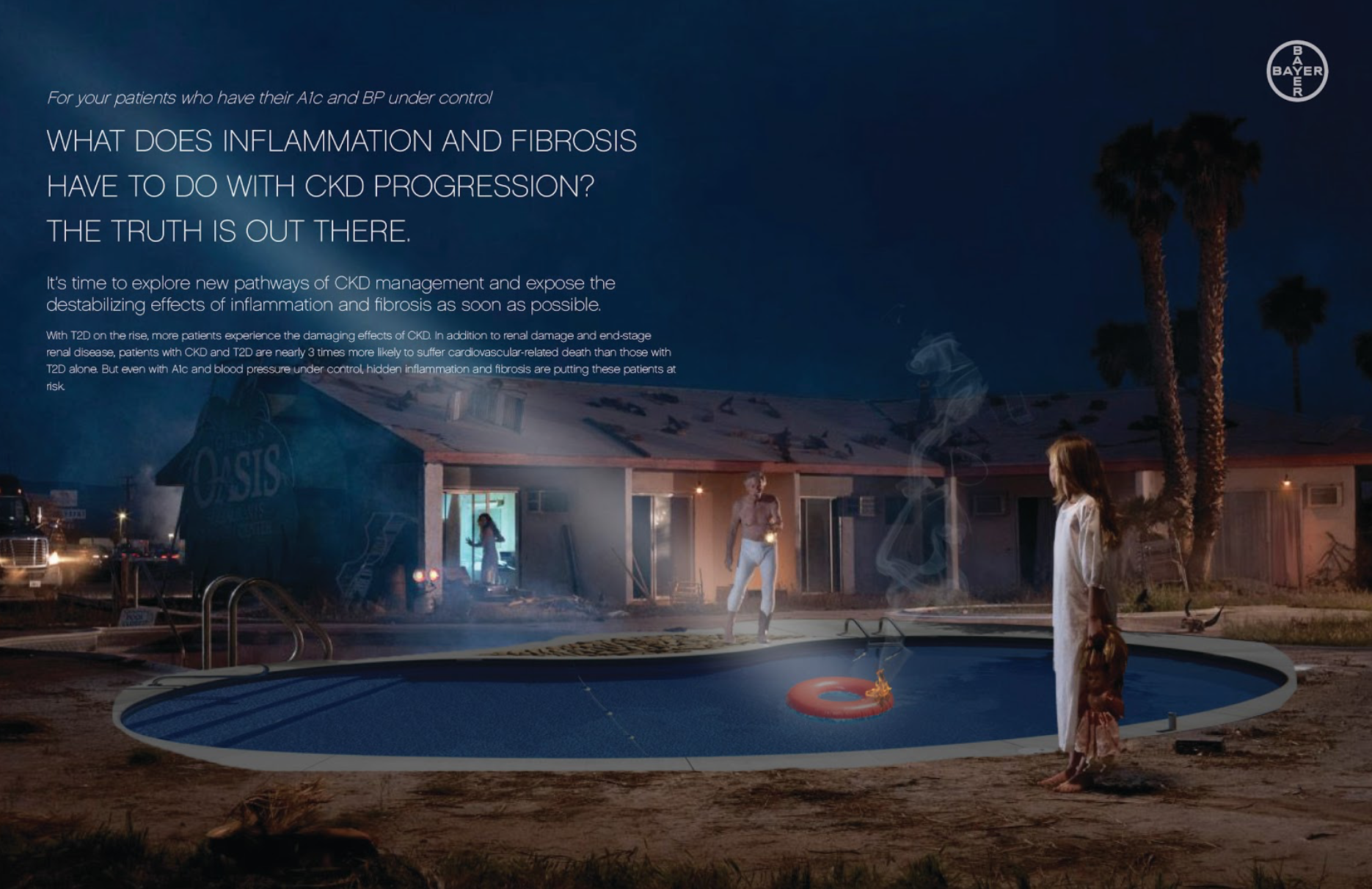 Inflammation and Fibrosis are directly linked to CKD progression – let’s help doctors diagnose this ASAP. Using photography in the mysterious style of Gregory Crewdson, we hide the kidney shape to reinforce the mystery around these symptoms.